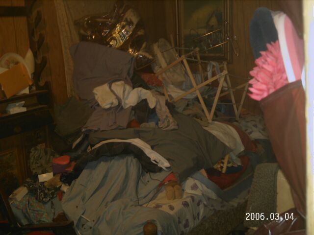 Bedroom 1 Filename: 008-IMG_0039.jpg ID: 24 Clothes and other items taken from dresser drawers of the guest room one of the grandaughters uses during routine friday night stayovers. Then a clothes drying rack thrown on top by officers, for good measure! (640x480) (42625 Bytes) [8236 Hits]