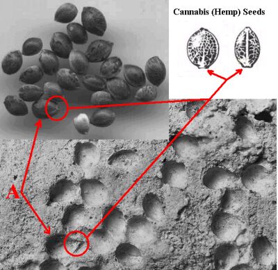 The impressions caused by seeds are not of hemp. They are too small, for instance, do not have the right shape nor the right type of surface pattern. The long, grooved stems are not incontestably identifiable as Ephedra. The original contents consisted in my opinion of broomcorn millet (Panicum miliaceum) and the stems might also belong to this cereal, although that cannot be proven. (SEE Note 2. below)